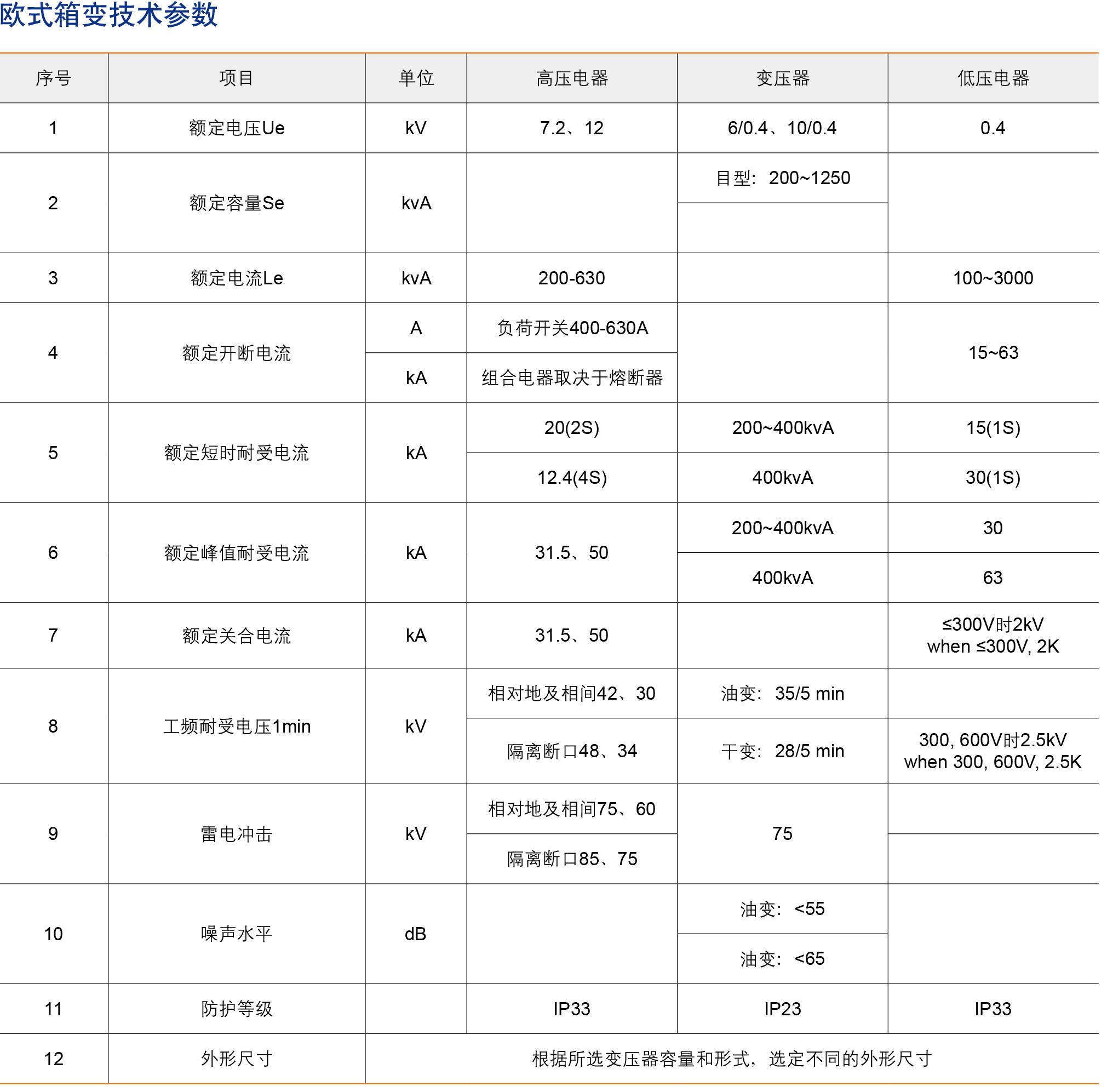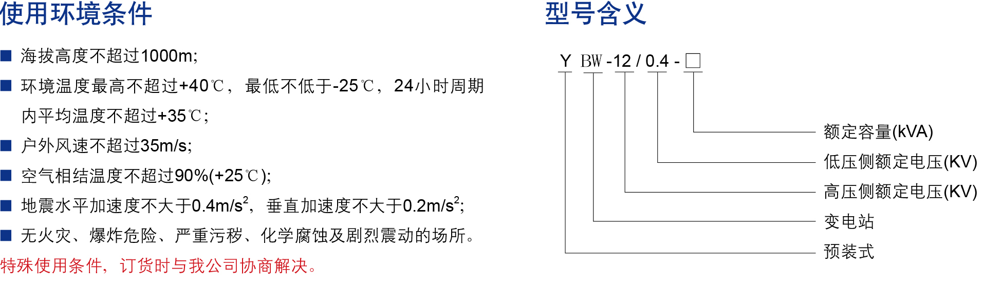 YBW-12/0.4高压/低压预装式变电站,俗称欧式箱变,是将高压电器设备、变压器、低压电器设备等组合成紧凑成套配电装置,用于城市高层建筑、城乡建筑、居民小区、高新技术开发区、中小型工厂、矿山油田以及临时施工用电等场所,作配电系统中接受和配电能之用。具有成套性强、体积小、结构紧凑、运行安全可靠、维护方便、以及可移动等特点,与常规土建筑变电站相比,同容量的预装式变电站占地面积通常仅为常规变电站的1/10~1/5,大大减少了设计工作量及施工量,减少了建设费用。在配电系列中,可用于环网配电系统,也可用于双电源或放射终端配电系统,是目前城乡变电站建设和改选的新型成套设备。产品符合GB/T 17467《高压/低压预装式变电站》的标准。